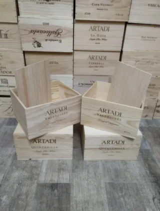 Conjunto de cinco cajas de madera con tapa corredera, ideales para almacenar o transportar botellas de vino. - Diseño clásico y rústico. - Tapa deslizante para fácil acceso. - Perfectas para coleccionistas o bodegas.