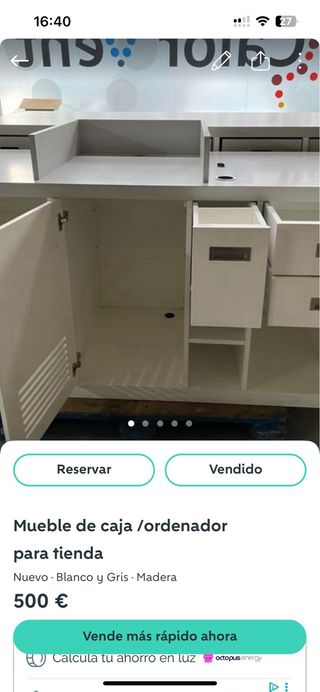 Mueble funcional para tienda, ideal para caja o zona de ordenador. Su diseño combina blanco y gris, con acabados en madera. - Estructura robusta. - Compartimentos de almacenaje. - Diseño moderno y limpio.