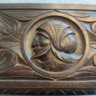 Preciosa caja de madera con un intrincado tallado. Medidas maximas 24x13x 12 alto. - Diseño con rostro en relieve. - Detalles florales en los laterales. - Base con patas.