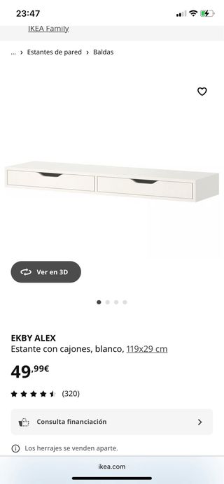Estante flotante EKBY ALEX de IKEA, perfecto como tocador. Cuenta con dos cajones para almacenamiento. - Diseño moderno y minimalista. - Acabado en blanco. - Medidas: 119x29 cm.