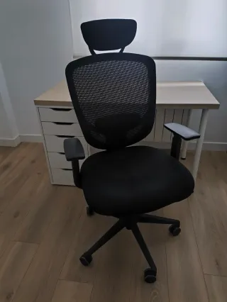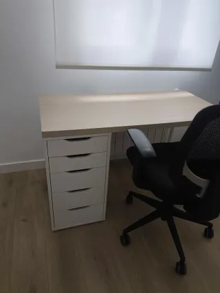 Conjunto de escritorio IKEA con una práctica cajonera y una silla de oficina. - Tablero de madera. - Cajonera ALEX blanca de cinco cajones. - Silla de oficina negra con ruedas. El escritorio tiene algunos pequeños arañazos pero está en buen estado y se puede seguir usando sin problema. La silla tiene un asiento bastante amplio y cómodo.