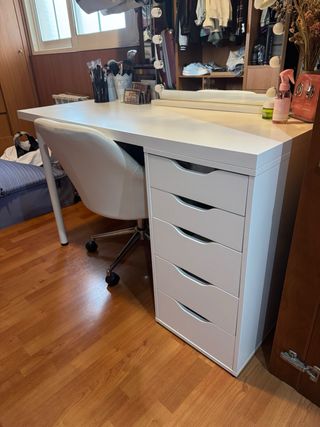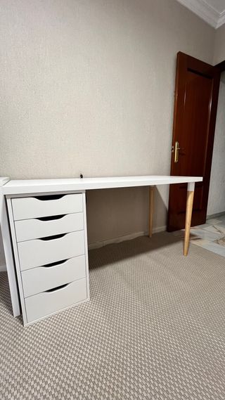 Conjunto de escritorio y cajonera Alex de Ikea. - Diseño moderno y funcional. - Acabado en blanco. - Cajonera con múltiples compartimentos. ESPEJO NO INCLUIDO