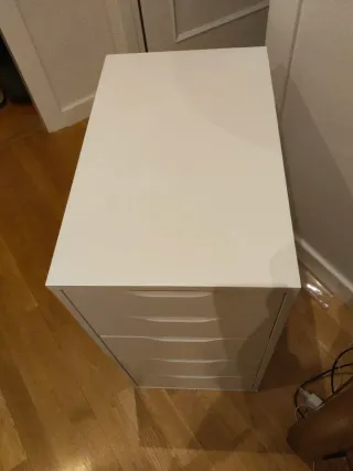 En muy buen estado, poco uso. Solo tiene cuatro agujeros muy pequeños en la parte superior de estar fijada a un tablero. Cómoda alta Alex de Ikea, con un diseño moderno y funcional. - Amplio espacio de almacenamiento. - Acabado liso y fácil de limpiar.