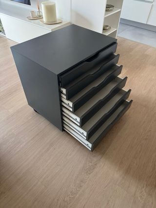 Cajonera de IKEA en color negro, con ruedas. Ideal para escritorio u oficina. Tiene 6 cajones amplios y sólidos, con buen deslizamiento. Estructura estable y resistente. Estado: segunda mano, en buen estado general, con leves marcas de uso normales (ver fotos). Se entrega montada. Fácil de mover gracias a las ruedas.