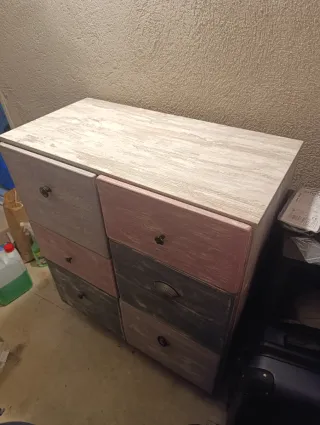 Cajonera de seis cajones con un diseño vintage y acabado desgastado. Ideal para añadir un toque de color y estilo a cualquier habitación. - Seis cajones de diferentes colores: lila, rosa, gris y azul marino. - Tiradores de estilo antiguo. - Acabado pintado a mano con efecto desgastado.