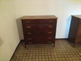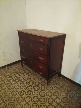 Comoda antigua con 4 cajones grandes y 1 cajon oculto. La encimera es de marmol. El marmol esta rajado, pero no roto y falta algun tirador de los cajones. El estado es el que se ve en las fotos. Precio economico porque el que la quiera tiene que bajarla por escalera 2 pisos.