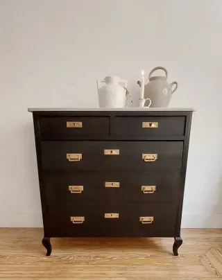 Cómoda modernista negra (años 20) Tiradores originales de latón Una llave original Encimera de mármol blanco y gris Amplios cajones. Gran capacidad de almacenaje. Muy buen estado a pesar de su antigüedad El mármol se separa del mueble para un fácil transporte