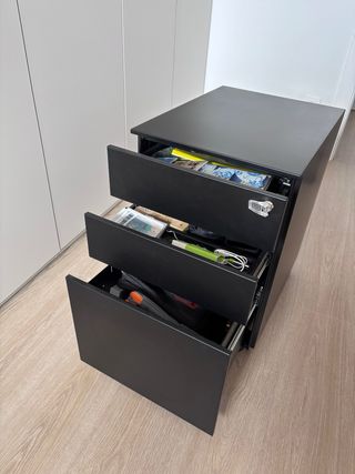 Cajonera archivador de Ikea en color marrón-negro. Cuenta con un cajón superior y un compartimento inferior con cerradura con archivador y 2 cajones. Estos cajones tienen 2 picadas en el interior, que se observa en las fotos. - Tiradores metálicos. - Ruedas para fácil movilidad. - Cerradura con combinación.