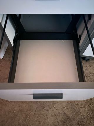 Cajonera archivador con un diseño moderno y funcional. - Tres cajones amplios para almacenamiento. - Tiradores metálicos plateados. - Cerradura en el cajón superior (no tiene la llave) - El primer cajón tiene la guía estropeada.