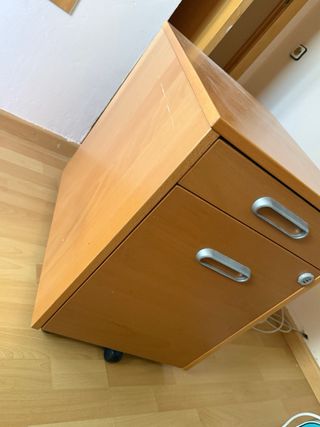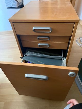 Archivador de oficina en madera color haya clara, con dos cajones amplios y cerradura con llave (incluida). Ideal para almacenar documentos, carpetas colgantes o material de oficina. Diseño moderno con tiradores metálicos y estructura resistente. En muy buen estado, solo con ligeras marcas de uso normales.