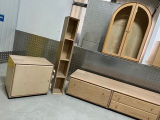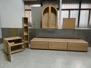 - Encimera/mesa compuesta por 3 cajoneras independientes. - Vitrina con puertas de cristal y dos baldas interiores de cristal (en la foto no aparecen). - Mueble bar para copas y bebidas. - Columna estantería. - Cajonera con ruedas Tanto el mueble bar como la vitrina se pueden colgar en la pared. ENCIMERA CON 3 CAJONERAS: - Ancho: 240cm (ancho cada cajonera: 80cm) - Alto: 40cm - Profundo: 60cm COLUMNA ESTANTERIA: - Ancho: 20cm - Alto: 140cm - Profundo: 25cm VITRINA: - Ancho: 80cm - Alto: 115cm - Profundo: 30cm MUEBLE BAR: - Ancho: 60cm - Alto: 52cm - Profundo: 30cm CAJONERA CON RUEDAS: - Ancho: 60cm - Alto: 56cm - Profundo: 45cm