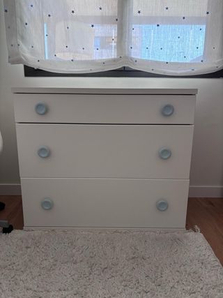 Medidas 104x55,5x90 Color blanco con tiradores azul bebé 3 cajones NO SE DESMONTA, NO SE ENVÍA