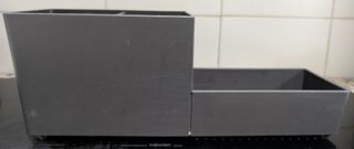 Estupendo organizador de cubiertos de Ikea, color negro y hecho de plástico. Es perfecto para mantener tu cocina ordenada. - Diseño de dos piezas que se pueden usar juntas o por separado. - Ideal para cubiertos, utensilios de cocina u otros objetos pequeños. - Se encuentra en buen estado, con algunas marcas de uso mínimas.