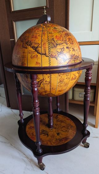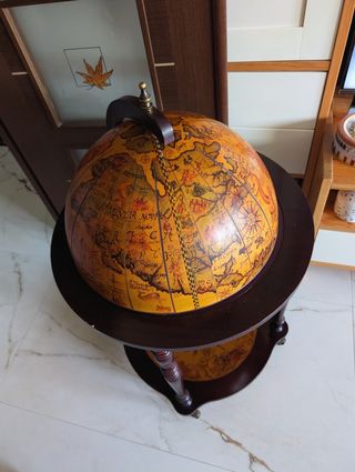 Preciosa licorera con forma de globo terráqueo antiguo. Ideal para amantes de lo clásico y el buen gusto. - Estructura de madera oscura. - Diseño detallado del mapa. - Perfecta para decorar y almacenar bebidas.