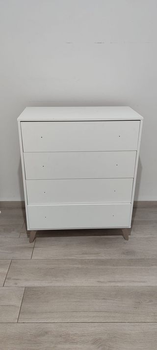 Cómoda con cuatro cajones de líneas sencillas y diseño moderno. - Acabado en blanco. - Fabricada en madera. Tiene 6 meses de uso, la vendo por mudanza