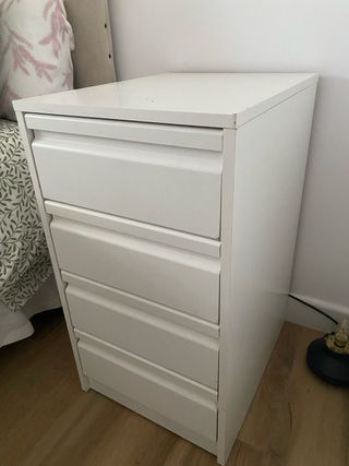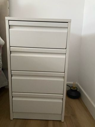 Cajonera de cuatro cajones con un diseño moderno y limpio. - Cuatro cajones amplios. - Acabado en color blanco. Pequeños desperfectos, que se ven en las fotos, nada que no se pueda solucionar. Ideal para poner dentro de un armario