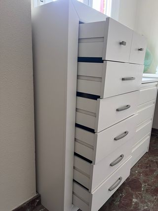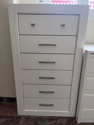 Preciosa cómoda de madera, color blanco. Ideal para dormitorio o cualquier habitación. - Seis cajones espaciosos. - Diseño limpio y elegante. - Nueva, sin haberse usado nunca. Por error compramos esta cómoda q es demasiado grande y pasado el plazo de devolución. La damos montada.