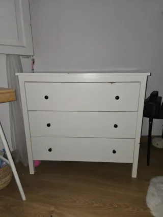 Cajonera de tres cajones de la marca Ikea. Su diseño es sencillo y funcional, aportando un toque de orden a cualquier habitación. - Cajones con tiradores negros. - Acabado en color blanco.