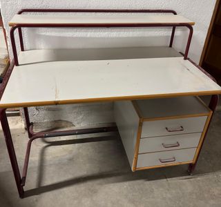 Escritorio funcional con un diseño moderno y práctico. Se vende por Reforma Integral de OFICINA. Dimensiones en la última foto TRANSPORTE INCLUIDO SE LIMPIARÁ PERFECTAMENTE ANTES DE LA ENTREGA - Superficie de trabajo espaciosa. - Cajonera integrada con tres cajones. - Estante superior para almacenamiento adicional. - Estructura de metal resistente. - Acabado en blanco y detalles en madera.