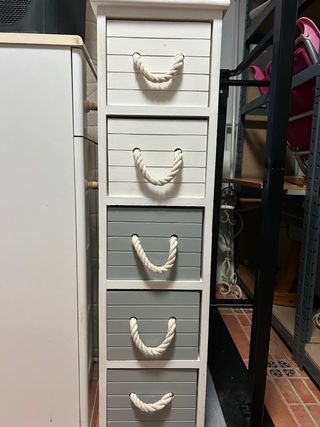 Vendo cajonera de madera con 4 cajones, ideal para dormitorio, habitación infantil, recibidor o como mueble auxiliar. Diseño estilo nórdico, en color blanco con estructura en madera natural, muy combinable y funcional. 📏 Medidas del mueble: Ancho: 35 cm Alto: 72,5 cm Fondo: 28 cm 📦 Medidas de cada cajón: Ancho: 31 cm Fondo: 26 cm Alto: 12,5 cm ✔️ Buen estado ✔️ Cajones amplios y cómodos ✔️ Ocupa poco espacio ✔️ Ideal para ordenación 📍 Recogida en mano solo los fines de semana.