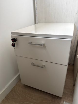 Cajonera de oficina en color blanco, ideal para organizar documentos. - Dos cajones con tiradores metálicos. - Cerradura con dos llaves incluidas.