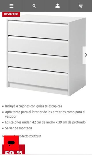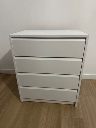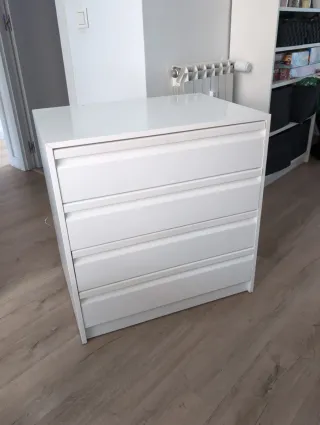 Cajonera de cuatro cajones con un diseño moderno y limpio. Su acabado liso la hace fácil de integrar en cualquier habitación. - Cuatro cajones amplios. - Tiradores de uñero - Medidas 80x50 y 72,5 de alto. - tiene agujeros de tornillos ya que estaba en un armario empotrado.