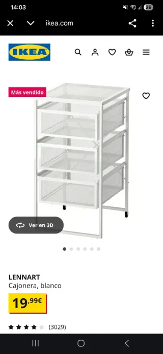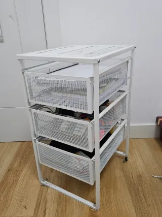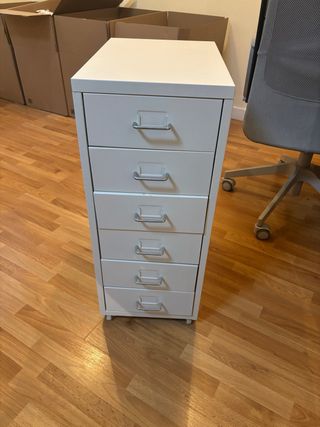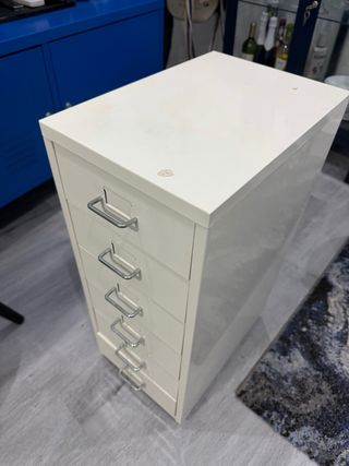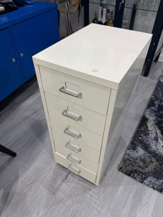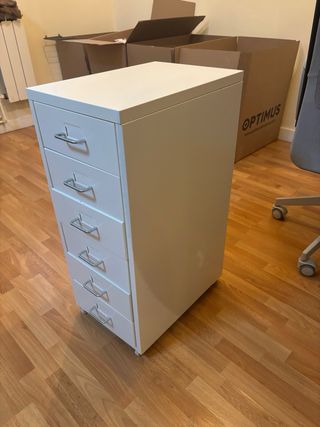 Cajonera HELMER de IKEA, sin usar y lista para darle un nuevo hogar. Su diseño moderno y funcional la hace perfecta para organizar tus pertenencias. - color blanco - 5 cajones. - Métela debajo de tu mesa de estudio o trabajo. - En acero, resistente. - Flexibilidad y orden - precio actual en web Ikea 54,99 euros - Cuenta con ruedas para facilitar su movilidad. - Fabricada en metal resistente. - A recoger en Logroño