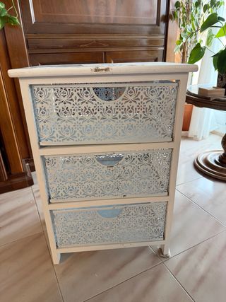 Pequeña cajonera con un diseño encantador. - Estructura principal de madera. - Cajones con detalles calados en metal. - Acabado en color blanco.