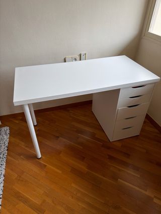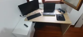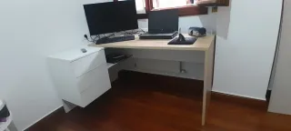Conjunto de escritorio de madera con una práctica cajonera blanca. - Diseño moderno y funcional. - Amplia superficie de trabajo. - Cajonera con tres compartimentos. Dimensiones: Largo: 145cm Ancho: 120cm (incluyendo cajonera)