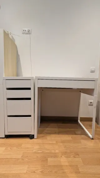 Conjunto de escritorio y cajonera a juego en color blanco. - Diseño moderno y funcional. - Cajonera con ruedas para fácil movilidad.