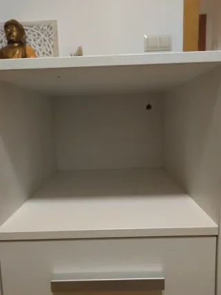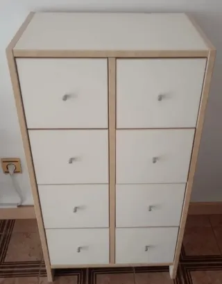 Mueble de almacenaje con cajones, ideal para organizar tus pertenencias. Su diseño se adapta a diferentes estilos de decoración. - Acabado en tonos beige y blanco. - Combina materiales de madera y plástico. Recoger 18 de enero. La podemos desmontar
