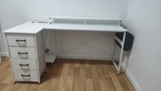 Mesa de ordenador con un diseño moderno y funcional. - Superficie de trabajo espaciosa. - Cajonera de plástico con ruedas con tres cajones. - Silla ajustable Precio por todo 110 euros