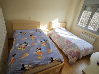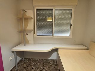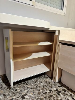 Conjunto de escritorio con dos módulos de cajoneras y una silla. - Escritorio con superficie blanca y diseño curvo. - Módulo de cajoneras blanco de 5 cajones. - Módulo de cajoneras de madera con 3 cajones y ruedas. - Silla blanca de plástico. - 2 camas de 90: SOLO ESTRUCTURA, el somier y el colchon no incluidos medidas: - mesa 148.5 x 55 - estanteria pequeña: 100 x 35.5 x 31,5 - estanteria grande: 195 x 35.5 x 31.5