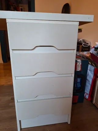 Cajonera de escritorio con un diseño moderno y funcional. Combina materiales de calidad para un uso duradero. Tiene una marca en la parte trasera de perdida del color pero no es apreciable a la vista dado que es la parte que daría a la pared y la madra levantada en la esquina inferior izquierda pero nada exageradamente notable Viene incluida la puerta del zapatero ( el hueco al lado de los cajones). Contiene: - Cajonera con cuatro cajones. - Tiradores decorativos. - Ruedas para fácil movilidad.