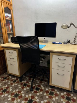 Vendo escritorio en muy buen estado, robusto y funcional. Medidas del escritorio: • Lados largos: 1,60 m x 1,60 m • Ancho lado cajonera: 0,60 m • Fondo lado opuesto: 0,80 m • Altura: 0,73 m Cajonera incluida (3 cajones): • Ancho: 0,43 m • Fondo: 0,60 m • Alto: 0,68 m *no encuentro la llave de la cajonera Acabado en madera color haya con estructura negra. Dispone de pata de acero con pasacables superior y interior para organización de cables. Se entrega desmontada con todos sus tornillos. No se hacen envíos, recogida en domicilio.