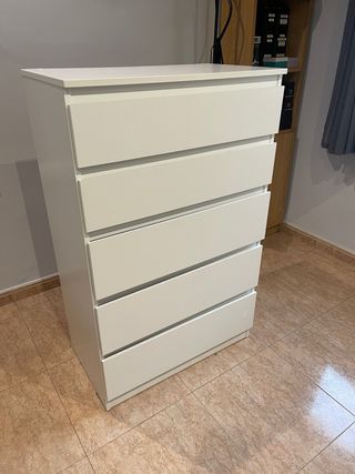 Cómoda de cinco cajones de Ikea. Solo venta en persona antes del 18/03 - Diseño moderno y funcional. - Acabado en color blanco. - Tiene dos cajones con la balda un poco doblada. Se tienen que volver a encajar.
