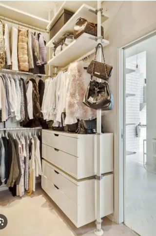 Sistema de armario vestidor modular de Ikea, modelo Stolmen en perfecto estado. En venta hasta el 22 de Marzo. Se puede organizar en un rincón como a través de una pared completa. Tanto los estantes, como pegar, como cajones de puentes separar y distanciar según su voluntad. No hay restricciones. La cuarta foto es como lo tengo en casa. Incluye; -7 estantes de 1'10m (2 están guardadas) -2 percheros de 1m (1 está guardado) -2 cajoneras dobles de 1'10m -una barra estructural de recambio Aparte un poco de suciedad está como nuevo. Desmontaje a cargo del comprador. - Estructura metálica. - Estantes de madera. - Componentes