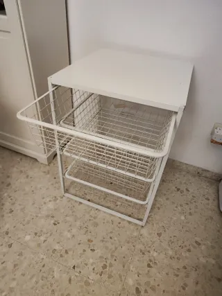 Mueble de almacenaje con cajones. Tiene puesto un vinilo imitación madera blanca de Leroy Merlin en la parte superior que le puse para ocultar algunos desperfectos. El segundo cajón hace algo de ruido al abrirse porque imagino que hay que apretar algo, pero se desliza perfectamente. No hago transporte del mueble ni lo desmonto. Si le interesa sería para recogerlo en mi apartamento.