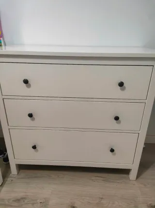 Cómoda de tres cajones modelo Hermes de Ikea. Su diseño es sencillo y funcional, con tiradores redondos de madera. - Tres cajones amplios. - Tiradores de madera. - Acabado en blanco. Tiene dos marcas, se ve en las fotos adjuntas. Venir a recoger. Precio en Ikea 199€.