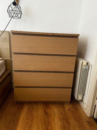 Cajonera de cuatro cajones de IKEA, modelo MALM. - Acabado en madera de roble. - Cuatro cajones amplios para almacenamiento. - En perfecto estado pero tiene un golpe pequeño en el zocalo
