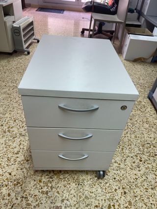 Se venden 4 cajoneras metálicas de oficina, en buen estado y muy resistentes. Ideales para oficinas, despachos, coworking o empresas. Características: - Material: metal - Color: gris - 3 cajones - Cerradura con llave (incluye llaves) - Con ruedas - Medidas: 42 × 55 × 55 cm (ancho × fondo × alto) - Estado: usadas, funcionamiento correcto (ver fotos) Disponibles: 4 unidades Recogida en mano Están en Badalona, cerca del centro comercial Magic Badalona