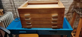 Cajonera de madera con un diseño tipo imprenta. - Estructura de madera. - Cajones con tiradores metálicos. - Color principal marrón.