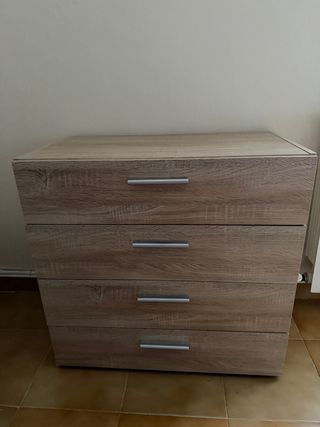 Cómoda con cuatro cajones, ideal para organizar tu espacio. - Diseño moderno con acabado en madera. - Tiradores metálicos. - Amplio espacio de almacenamiento. - Montado pero sin uso. Precio de compra: 85€.