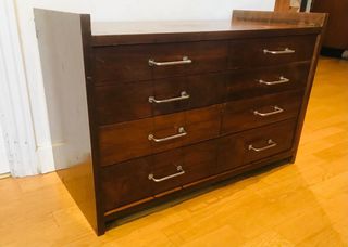 Cómoda de madera maciza con 12 cajones y tiradores metálicos estilo clásico. Gran capacidad de almacenaje. Perfecta para salón, habitación o entrada. Madera resistente con carácter, algunos signos de uso (ver fotos). Se puede restaurar fácilmente si se desea. Medidas aproximadas: 150x90 Ideal para decoración vintage o funcional.