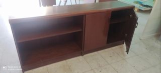 Mueble auxiliar despacho madera de cerezo con estantería y puertas de 185 x42 y 80cm de alto. se regala la mesa desmontada *Mesa de despacho en L con cajonera 2 cajones , bandeja teclado y faldones . tablero principal mide 178x95 y la auxiliar 108x56 de alto 80cm ***A LA MESA LE FALTAN LOS TORNILLOS DE MONTAJE***