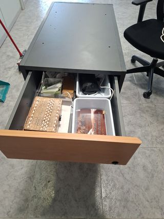 Conjunto de escritorio con cajonera y silla de oficina. - Escritorio con superficie de madera y estructura metálica. - Silla de oficina con asiento y respaldo de tela. - Cajonera de tela con dos compartimentos. Recogida cerca de Plaza Molina