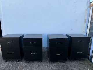 Conjunto de cuatro cajoneras de oficina en color marrón oscuro. Cada unidad cuenta con ruedas para facilitar su movilidad. - Diseño moderno con tiradores metálicos. - Estructura robusta.