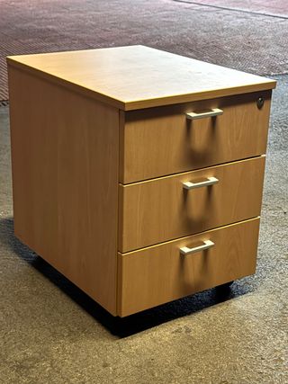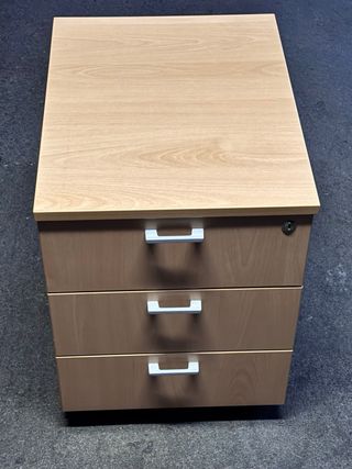 Mueble de oficina con tres cajones y acabado en madera. - Diseño moderno con tiradores rectangulares. - Cerradura de seguridad en el cajón superior. Solo recogida en Collado Villalba Viernes 29/ sábado 30