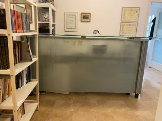 Mueble de recepción con un diseño moderno y funcional. - Encimera de cristal. - Estructura de metal. - Paneles frontales translúcidos. - Mesa de escritorio al otro lado con cajonera. - Regalo silla con ruedas. Medidas: - 222cm de largo el cristal - 80 cm la L de profundidad.