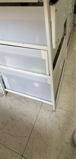Cajonera Lotte de Ikea, un mueble práctico y funcional para organizar tus espacios. Está usado y tiene marcas de desgaste en la superficie (se ve en las fotos), pero está firme y funcional. Perfecto para exteriores, trasteros, lavaderos o baños. No es nuevo, no es perfecto, pero hace el trabajo. - Diseño moderno y minimalista. - Acabado en blanco que combina con cualquier decoración. - Estructura robusta de metal.